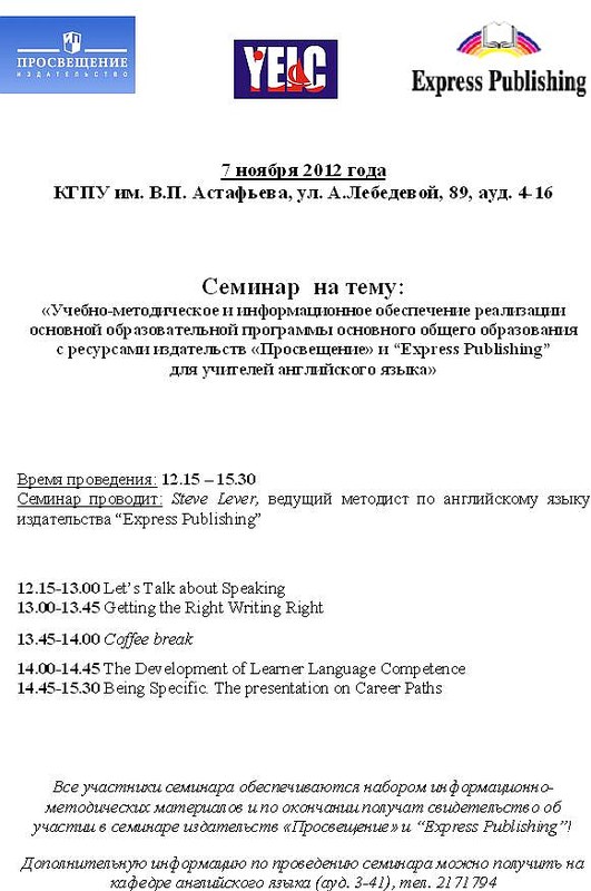 Кафедра английского языка приглашает всех желающих принять участие в семинаре, организованном совместно с издательствами «Просвещение» и Express Publishing .